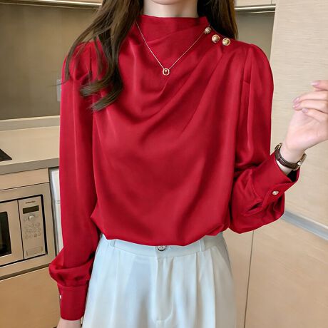 ドレープデザイン×ゴールドボタンが映える長袖ブラウスです。