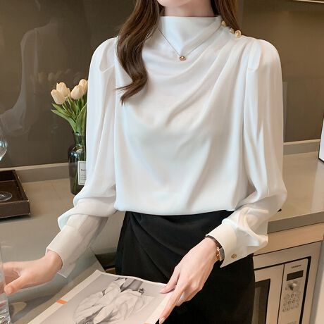 ドレープデザイン×ゴールドボタンが映える長袖ブラウスです。