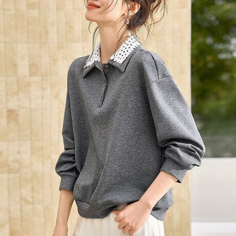 柔らかなスウェット生地に、配色のレース襟を組み合わせることで、カジュアルながらも上品な印象に。