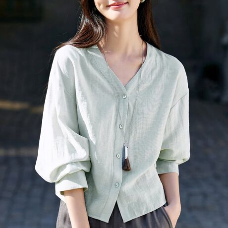 Vネックとフロントボタンが上品な印象の長袖ブラウスです。