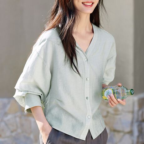 Vネックとフロントボタンが上品な印象の長袖ブラウスです。