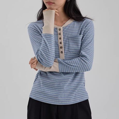 ボーダー柄に配色ディテールを組み合わせた長袖トップスです。