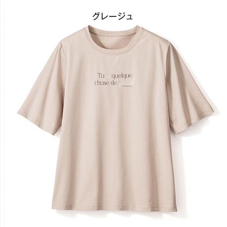 [型番:52694]二の腕を隠す五分袖に、背中や脇の肉感を拾わない余裕のあるシルエット。シルケット加工の光沢が上質な、大人仕様のTシャツです。上品なラメ入りロゴがポイントになり、若々しく華やかな表情に。※グレージュ LLサイズの販売はございません。