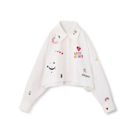 Cath Kidstonのアートをペタペタとコラージュしたような、たくさんのアートが散りばめられたショートシャツ。刺繍とプリントを組み合わせ、こだわりたっぷりにデザインされたシャツは、存在感抜群!かなりのオーバーサイズでデザインされたシャツは、着ると程よい抜け感が生まれ、こなれた印象に。ゆったりとしたサイズ感ですが、ショート丈のため重たくならず、バランスよくコーディネートしていただけます。薄手でありながらもハリのある、しなやかなタイプライター素材のシャツは、カジュアルになりすぎず、程よいきちんと感が大人っぽく見せてくれるポイントです。ボタンにはCath Kidstonのロゴ入り。