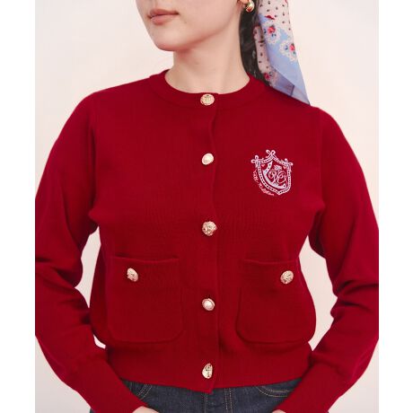 トレンドのジャケット型シルエットで仕立てた、上品なニットカーディガン。 新デザインのエンブレム刺繍が、落ち着いた大人の可愛さを引き立てます。こだわりは、フロントにあしらった数種類の金ボタン。表情の異なるボタンを組み合わせることで、いつものスタイルをワンランク上の着こなしへと導いてくれます。 シルエットを美しく保つ程よい肉感がありながら、さらりと羽織れる素材のため、春先や秋口でも快適に。着る人を選ばないジャストなサイズ感と、袖をポワンとさせた柔らかなラインが、女性らしい印象をプラスします。単体ではもちろん、ボウタイブラウスを合わせて襟元にアクセントを添えたり、販売中のショートスリーブニットとアンサンブルで楽しむのもおすすめ。カジュアルなボトムスと合わせても上品にまとまる主役級のアイテムです。