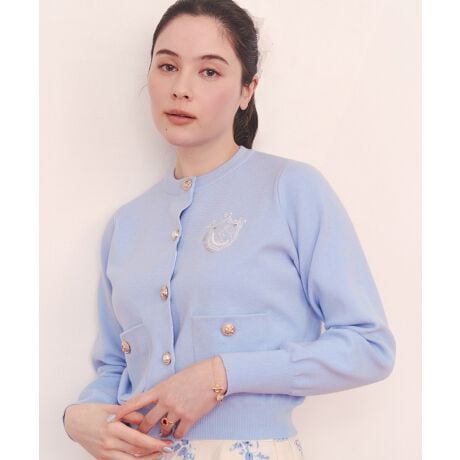 トレンドのジャケット型シルエットで仕立てた、上品なニットカーディガン。 新デザインのエンブレム刺繍が、落ち着いた大人の可愛さを引き立てます。こだわりは、フロントにあしらった数種類の金ボタン。表情の異なるボタンを組み合わせることで、いつものスタイルをワンランク上の着こなしへと導いてくれます。 シルエットを美しく保つ程よい肉感がありながら、さらりと羽織れる素材のため、春先や秋口でも快適に。着る人を選ばないジャストなサイズ感と、袖をポワンとさせた柔らかなラインが、女性らしい印象をプラスします。単体ではもちろん、ボウタイブラウスを合わせて襟元にアクセントを添えたり、販売中のショートスリーブニットとアンサンブルで楽しむのもおすすめ。カジュアルなボトムスと合わせても上品にまとまる主役級のアイテムです。