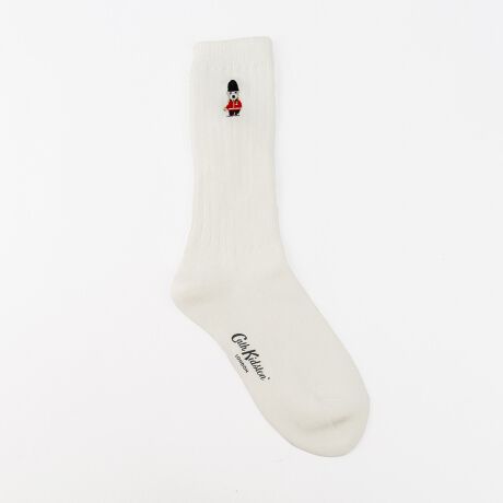 [型番:01ACZ002]ロンドンの兵隊さんに扮した犬のアートを刺繍した、アイコンソックス。ホワイト、ネイビー、レッドと、トラッドに着こなせるカラー展開です。コットン素材で太めのリブでカジュアルなデザインなので、デイリーに使いやすく、スニーカーだけでなく、ローファーなどとも相性よく履いていただけます。ピンクの帯紙に包んで、ビニール袋に入った状態でお届けになります。足底21-23cm対応