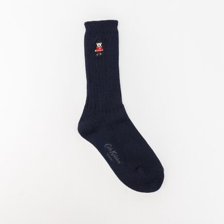 [型番:01ACZ002]ロンドンの兵隊さんに扮した犬のアートを刺繍した、アイコンソックス。ホワイト、ネイビー、レッドと、トラッドに着こなせるカラー展開です。コットン素材で太めのリブでカジュアルなデザインなので、デイリーに使いやすく、スニーカーだけでなく、ローファーなどとも相性よく履いていただけます。ピンクの帯紙に包んで、ビニール袋に入った状態でお届けになります。足底21-23cm対応