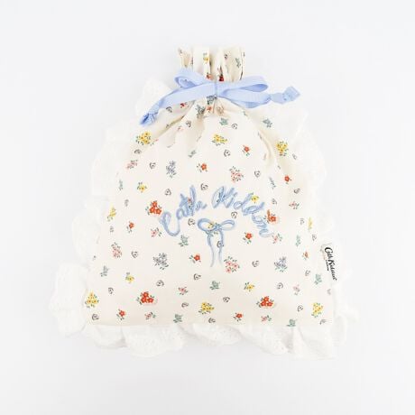 [型番:01ADZ031]人気の高い巾着ポーチに、コットンレースのフリルデザインが新登場!デイリーに寄り添いながら、使うたびに気分を上げてくれて、自慢したくなるアイテムです♪薄手のコットン素材なので、嵩張らずにお使い頂けます。同じシリーズのバッグやポーチとお揃いでお使いいただくのもおすすめです◎【Button Block Floral】レトロな小花柄の間にハート型のボタンが散りばめられたアート。お花に寄り添う手書きロゴがさりげないポイントです。