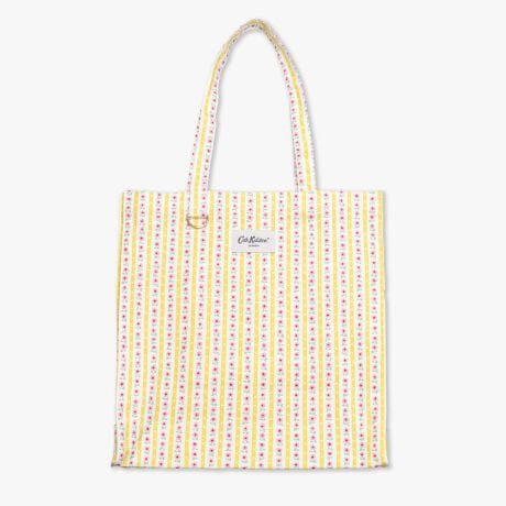 収納力たっぷりな、マチありデザインのスクエアトートバッグ。しっかりしつつも重たくならない、程よい厚さのコットンキャンバスに8種類のアートをプリントしました。まるで宝探しのように、お気に入りを探すワクワク感を楽しんでください♪バッグはA4サイズが横向きに余裕を持たせて入るサイズ感。もちろんPCも入るので、デイリー使いにはもちろん、一泊旅行にもおすすめです。内側には小物を入れられるポケットと、トートバッグの横幅と同じサイズの大きなポケット付き。PCや書類などがバッグの中で斜めにならず、すっきり収納していただけます。ハンドルは肩掛けできる長さで、チャームなどをつけられるDカン付きです。同じシリーズで展開しているハートフリルポーチチャームをつけるのもおすすめです。【Ribbon Bow】今シーズンイチオシのリボンアート。ストライプ調なので程よく大人っぽい仕上がりです。様々なアイテムで、カラー豊富に展開予定です。【Lace Hearts】レースハートにローズが描かれた、Cath Kidstonらしさが詰まったアート。ドットの組み合わせがポップな印象です。【Roses and Hearts】ローズの蕾と小さなハートが散りばめられたアート。アーカイブからアレンジされたアートは、ブラックやアイボリーベースで大人っぽい仕上がりです。【Flower Stripe】イエローのストライプにピンクのお花がポップで可愛らしいアート。どこか懐かしさを感じさせてくれる、レトロなデザインです。【Hankie rose】ミントカラーのベースにピンクのお花が散りばめられた優しい印象のアート。キュンとするような懐かしさのある、アーカイブのアートです。【Gingham Bunches】手書きのギンガムチェックにミニブーケが散りばめられたフェミニンなアート。新作のアートを一足早くお披露目です。