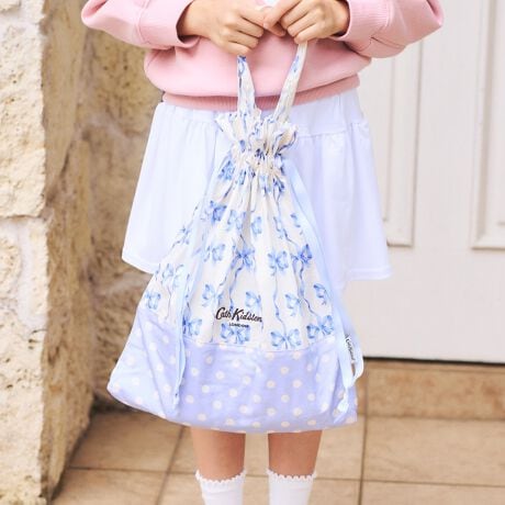 日本限定のキッズアイテムが初登場!日本の学校や幼稚園での生活に寄り沿いつつも、Carh Kidstonらしさ溢れるアートでHappyで毎日が楽しくなるアイテムたちです♪2つのアートを組み合わせた遊び心のあるドローストリングバッグ。柔らかな薄手のコットン素材で、軽く持てるのがポイントです。お子様の体操服入れはもちろん、旅行シーンなど、大人でもお使いいただけるアイテムです。同じアートの巾着シリーズでお揃いで揃えると、より可愛さアップ♪【Ribbon Bow】今シーズンイチオシのリボンアート。サックスのドットと合わせて、フェミニンながらも、少し背伸びした大人っぽさのあるデザインです。【Cowboy Ditsy】Cath Kidsrtonのアイコン的なアートである、カウボーイ。ストライプと組み合わせて元気いっぱいなデザインに仕上げています。