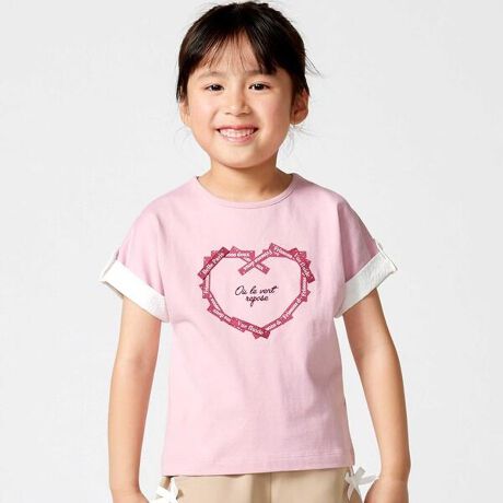 ロゴ入りのラベルを並べてハート型にしたプリントのTシャツ。