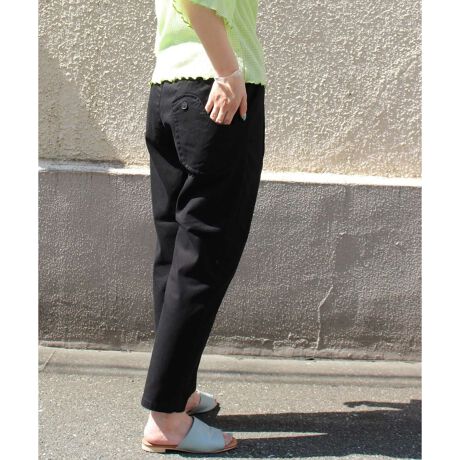 定番のとりポケットパンツ。ウエスト周りはゴム仕様でリラックス感もあり、裾にかけてすっきりとさせたペグトップのシルエットは、1枚でも、またチュニックシャツやワンピースとの重ね着にもおすすめの人気のパンツです。両サイドポケット付き。