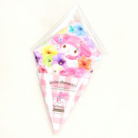 大人っぽいパステルビビットな水彩花柄とキャラクター達が戯れてるよ。まるで花束のようなブーケの形のタオルハンカチ。今年はツインリトルスターズも仲間入り!