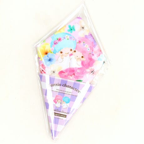 大人っぽいパステルビビットな水彩花柄とキャラクター達が戯れてるよ。まるで花束のようなブーケの形のタオルハンカチ。今年はツインリトルスターズも仲間入り!
