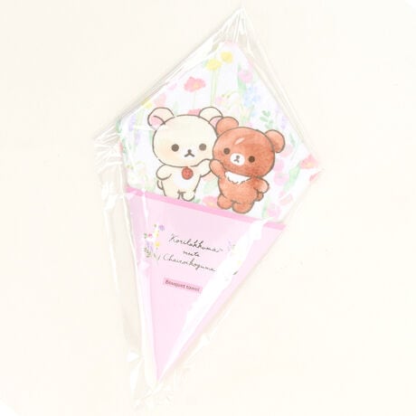 コリラックマとチャイロイコグマが仲良くお花畑でかくれんぼ。見ているだけで心が温まるシーンをブーケに。花束のような形をしたタオルハンカチです。