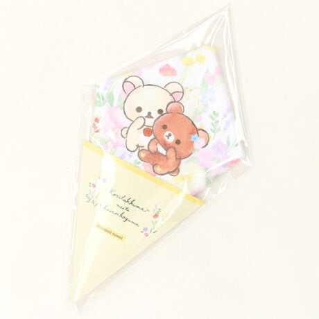 コリラックマとチャイロイコグマが仲良くお花畑でかくれんぼ。見ているだけで心が温まるシーンをブーケに。花束のような形をしたタオルハンカチです。