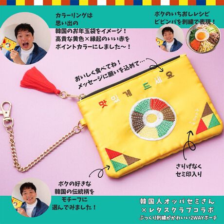 「美味しい韓国料理で心も身体も笑顔に」をテーマに活動している、今大注目の韓国料理インフルエンサーです。構想から発売までなんと約8か月。韓国人オッパセミさんの想いがたくさん詰まったポーチが完成しました。デザインはセミさん自慢のビビンバをこだわりの刺繍で再現。メインのフードアートを<畳刺繍>して立体感を残しながらその上にさらに刺繍を施してより美味しそうに見えるようにぷっくり感を演出!ビビンバモチーフの刺繍の上に書かれている「マシッケジュセヨ」は、「おいしく食べてね」というセミさんからの心からのメッセ―ジ。配色はセミさんの思い出の「韓国のお年玉袋」をイメージし、色は韓国で縁起がよいとされているカラーを採用! 高貴な黄色×縁起のいい赤をポイントカラーにしました。右下、左下にはセミさんの好きな韓国の伝統柄をモチーフにした柄を刺繍。