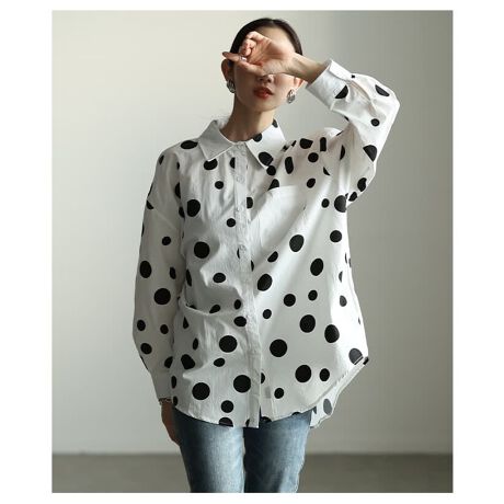 ランダムに散りばめたドット柄がさりげなく可愛いシャツ。着丈を長めに設計しているので、気になる下半身も自然にカバーしてくれます。甘すぎず、大人可愛いスタイルが楽しめる一着です♪