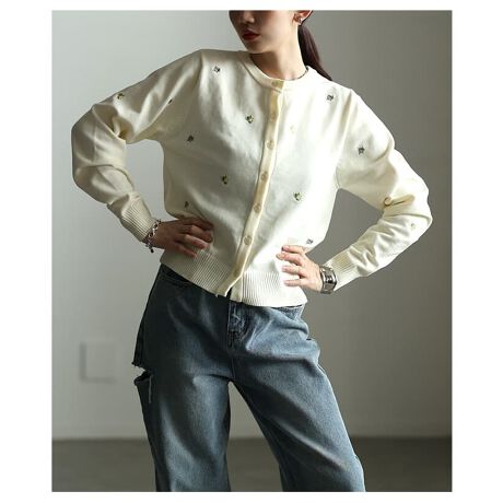 散りばめられた花&フルーツ刺繍が大人可愛い春にピッタリのカーディガンです。程よい丸首で羽織としては勿論トップスとして着こなすのもおすすめです☆