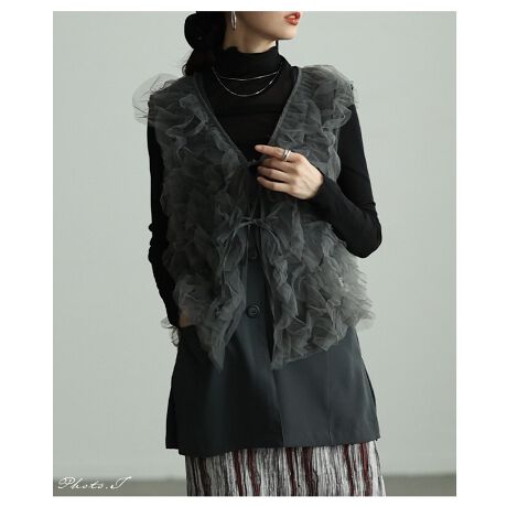 【トップス】 ジレ ベスト ジャケット 羽織り チュール フリル シアー アンサンブル 黒 グレー