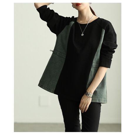 【トップス】 プルオーバー 異素材 デニム カットソー ドロスト ペプラム 配色 ブラック ブラウン