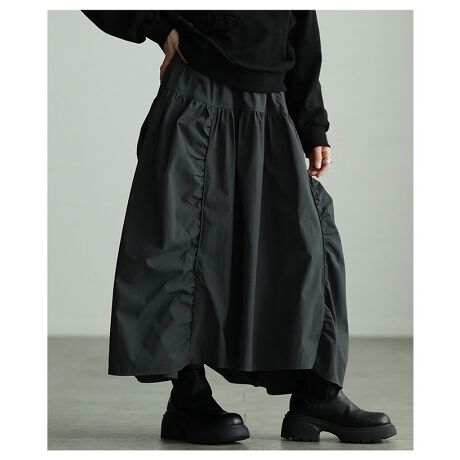 【スカート】 ギャザー 変形 切り替え ウエストゴム アシンメトリー ロング ブラック グレー 無地