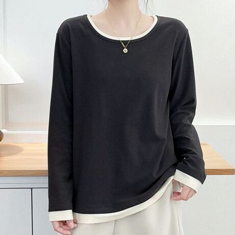 まるで重ね着しているような見え方を楽しめるフェイクレイヤードバイカラートップス。視線を分散する配色デザインによって全体のバランスを整えやすいのもポイント。気になる部分を自然にカバーしながら安心感のある着用感を実感できます。表裏ともにほんのり起毛感のある生地で、肌あたりが優しいです。デイリー使いはもちろん、ちょっとしたおでかけやリラックスしたいおうち時間にも活躍。いつものコーデに自然と馴染みながらワードローブに定着してくれる頼れるトップスです。
