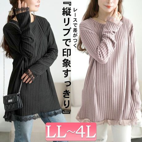 【大きいサイズ】 裾レースリブチュニック 大きいサイズ レディース トップス チュニック 裾レース