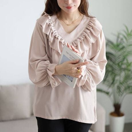 クラシカルに大人可愛い♪ティアードフリルVネックブラウスふわっと落ちるシルエットで体型を拾わないリラクシーなサイズ感◎Vネック&ティアードフリルデザインの首元で大胆に小顔見せ♪肩に掛かるフリルデザインで肩周りの華奢見せ効果も◎ぽわんっと可愛いキャンディスリーブで二の腕をお洒落にカバー♪