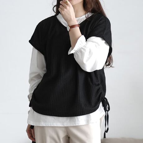 柔らかなカットソーインナーと、かぎ針編み風ベストを組み合わせたアンサンブルトップス。インナーは身幅・脇ぐりともにゆとりがあり、袖口ゴム仕様でブラウジングするとふんわりとした袖シルエットに。二の腕まわりも楽に着用できます。