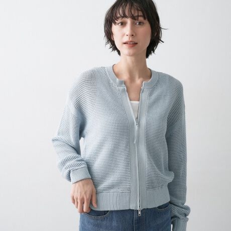 立体感のある編み地と、センターのジップデザインが程よいシャープさを添えます。