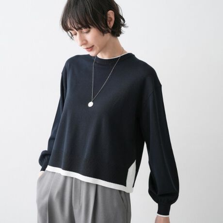 裾からのぞく配色デザインと二重襟が印象的な、バイカラーニット。