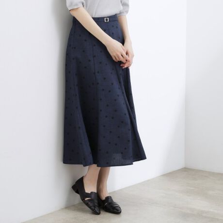 大きめでキャッチーなランダムドットプリントが目を引く、フレアースカート感覚で穿けるソフトマーメイドシルエット。