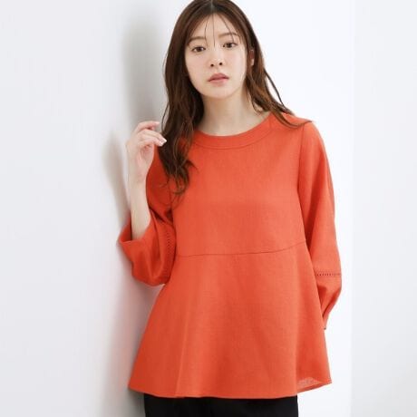 高めの位置で切り替えたペプラムシルエットが、さりげなくスタイルアップして見える旬顔ブラウス。