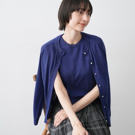 カーディガンには小ぶりなメタルボタンをあしらい、さりげない華やぎをプラス。