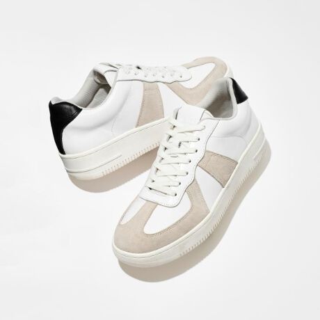 オールレザーのジャーマントレーナーの洗練されたデザインをベースに、バスケットボールシューズのようなボリューム感を加えた一足。