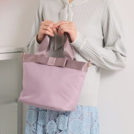 中央のリボンモチーフが目を引く、上品でフェミニンな舟形トート。