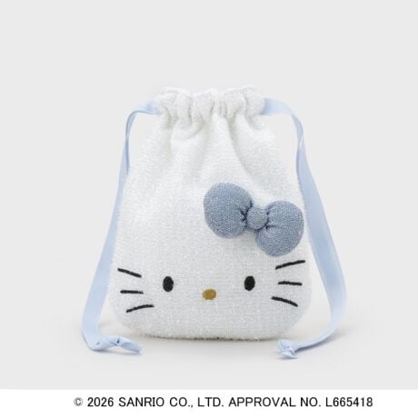 立体的なリボンが可愛らしい、ハローキティのお顔をあしらった巾着ポーチ。