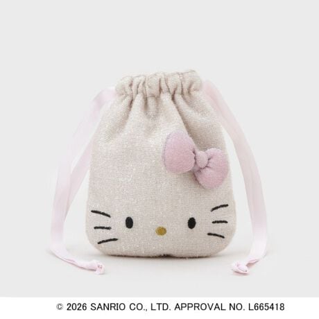 立体的なリボンが可愛らしい、ハローキティのお顔をあしらった巾着ポーチ。