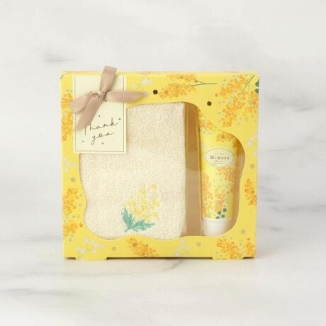 ミニハンドクリーム30gとミモザの刺繍入りタオルハンカチのギフトセット。