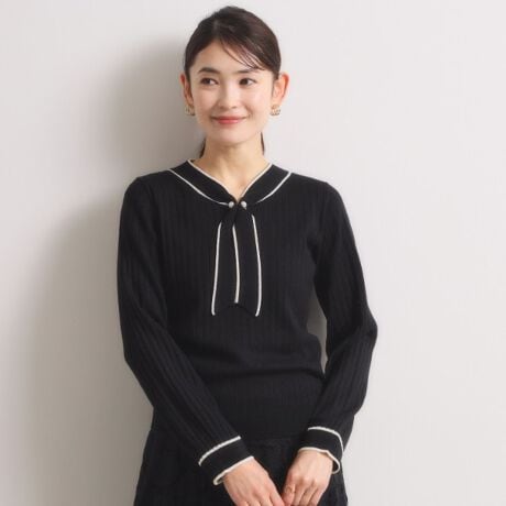 胸元にポイントがあるのでジャケットやコートINにも映え、アクセサリーなしでも華やかな印象に。