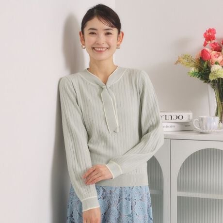 胸元にポイントがあるのでジャケットやコートINにも映え、アクセサリーなしでも華やかな印象に。