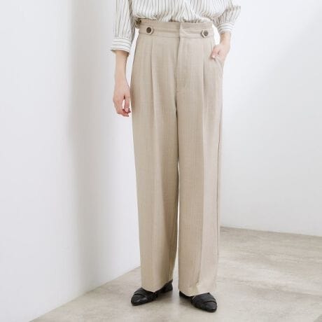 リネンライク素材にストライプ柄をのせた、ペーパーバッグデザインのワイドパンツです。