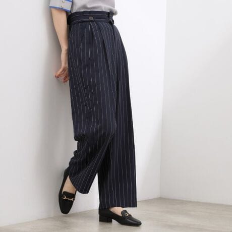 リネンライク素材にストライプ柄をのせた、ペーパーバッグデザインのワイドパンツです。