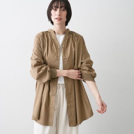 袖口はシャーリングゴム仕様で、たくし上げてもきれいに止まり、抜け感のある着こなしが楽しめます。