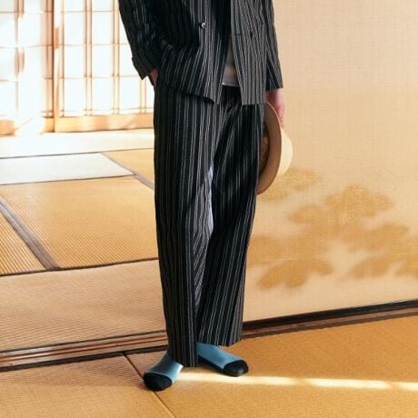 ウール産地である尾州の確かな織り技術で仕立てたコットンストライプのサッカー地を採用。