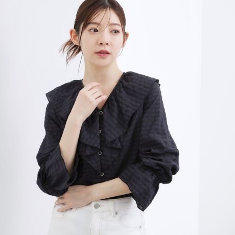 襟元のフリルが顔まわりを華やかに演出し、着こなしにやさしいアクセントを添えます。