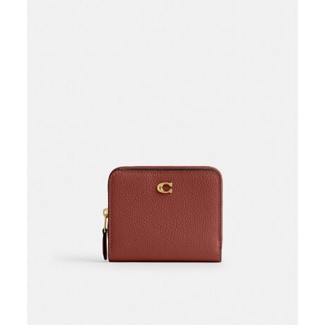 ポリッシュド ペブル レザーの二つ折りミニ財布。シグネチャー ハードウェアが目を引きます。3辺に大きく開く小銭ポケットは、レシートやイヤフォンの収納にも便利な仕切り付き。スナップを外すと、8層のカードポケットと札入れが広がります。