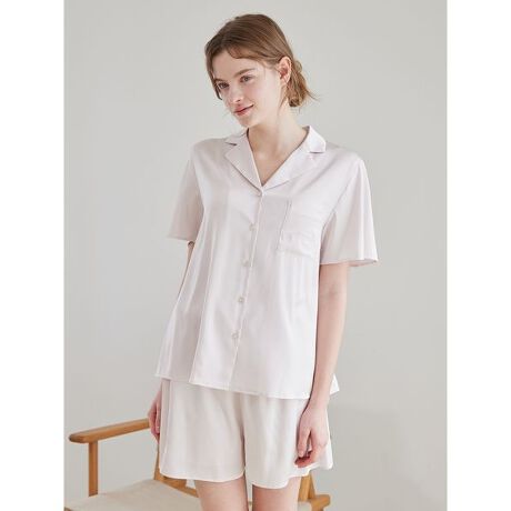 明るいカラーリングに心ときめくサテンシリーズです。爽やかな開襟デザインがリラックス気分を誘う、なめらかな肌触りのシャツ。胸ポケットにさりげなく刺繍を添え、軽やかなシルエットで仕上げました。色は定番のピンクと温かみのあるコーラル、黄み系の爽やかなグリーンをご用意。同シリーズのショートパンツとコーディネートしてお楽しみください。